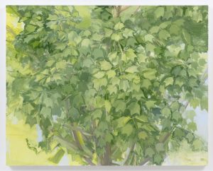 Summer Maple Detail 2016 och Winter Maple 2017 är två målningar av träd, en av ett bladverk den andra av kala stammar. Uttrycket är så oansenliga att jag först inte förstår vad de har i utställningen att göra. Sylvia Plimack Mangold har sedan 1970-talet observerat och gestaltat de här träden. Om sommaren ”en plain air”, på vintern från fönstret i sin studio norr om New York. Den informationen öppnar upp för helt nya frågor om löven och målningarnas utformning. Hur har konstnären lyckats upprätthålla motivationen? Finns det ett särskilt lugn som infinner sig när man väljer att beskåda ett träd från samma punkt år efter år?