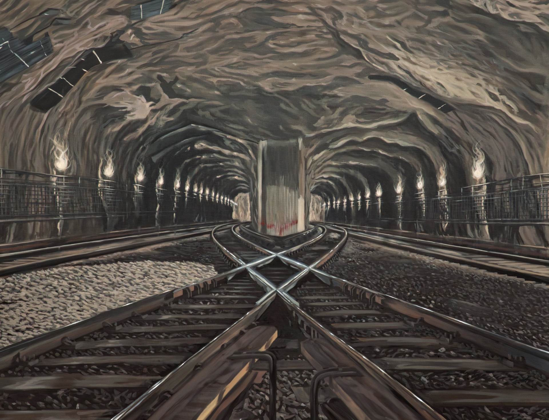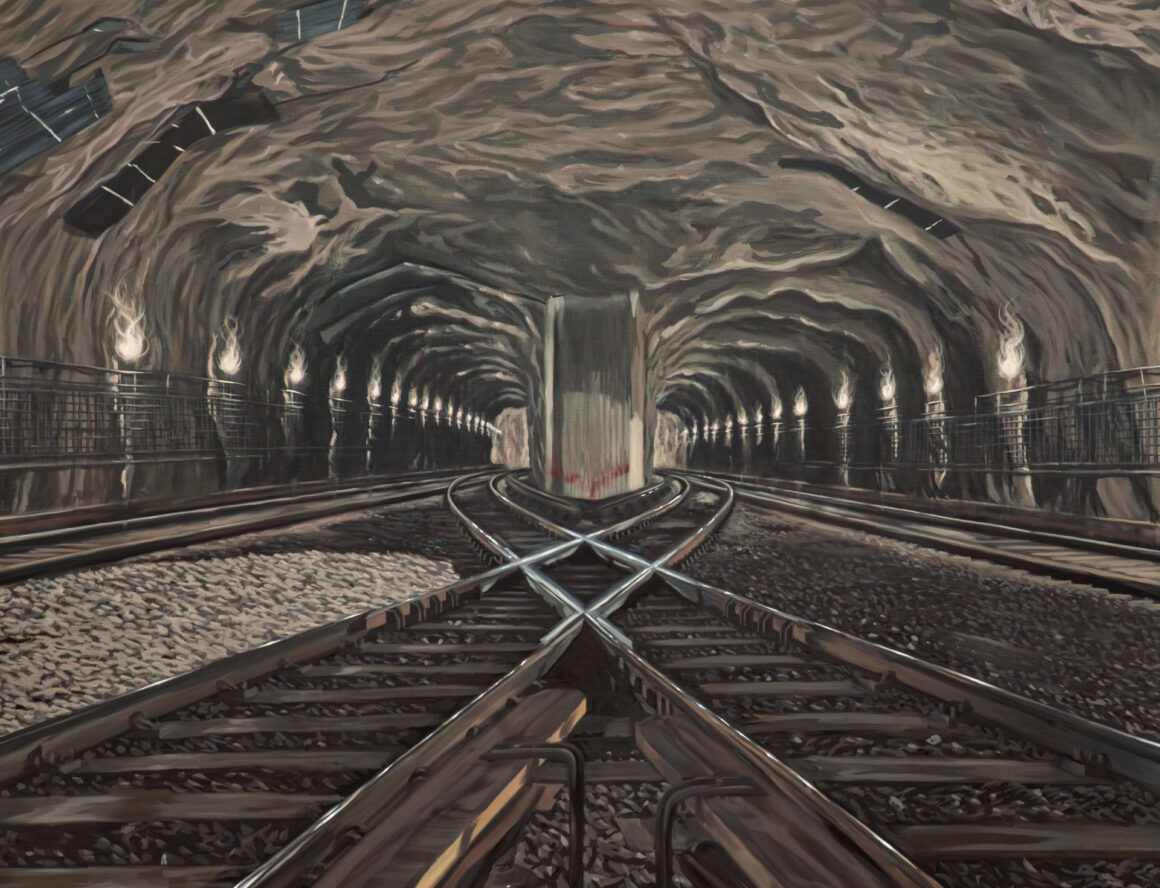 Hos Roger Smeby är det erfarenheter av en tillvaro under jord som banarbetare för SL. Det är ett extraarbete han haft under många år. Men i hans målningar är denna realistiskt avbildade miljö transformerad till något helt annat. En kultplats närmast, där allt får en annan innebörd, och där troligtvis allt kan hända, gott såväl som ont.
