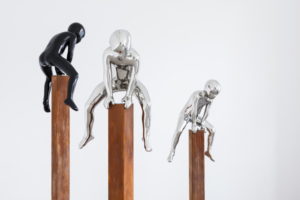 Skulpturerna ”Leap of Faith” möter mig i galleriets första rum. I ansiktshöjd svävar små kroppar mitt i ett språng över överdimensionerade piedestaler som sträcker sig mot galleriets tak. Trots det faktum att de är frusna finns det en otvungenhet i dessa figurer. Jag vänder mig mot att beskriva konst med antonymer men i detta fall går det ej att undvika. Dessa kroppar som Miesenberger skulpterat är frusna i tiden men är också samtidigt i rörelse. Ena sekunden är det som att titta på en film på paus medan jag i nästa sekund ser dem fullborda språnget och flyga över utställningsrummet. Det uppstår en spänning genom dessa motsättningar vilket får skulpturerna att vibrera av pregnans.
