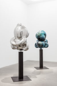 Ett annat motiv som funnits i Miesenbergers repertoar ett tag är nallebjörnen, och på Anna Bohman Gallery fyller de upp och nedvända nallarna i verken ”Reflections on the presence of time” hela andra rummet. Några är mindre i formatet medan andra är massiva vilket ytterligare förstärks av materialanvändningen. De är gjutna i antingen brons eller rostfritt stål. Deras runda former och det faktum att de står på huvudet gör att jag först knappt uppfattar motivet. Men när jag väl identifierat nallen är det nästan omöjligt att inte göra en väldigt uppenbar jämförelse.