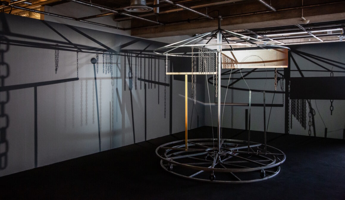 Detta på ett brutalt sätt vackra verk med kakofoni av ljud, rörelse och dansande skuggor på betongväggarna omkring ingår i den nyöppnade separatutställningen Festen som inte blev av.