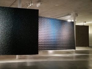 Också de stora gobelängerna i Marabouparkens konsthall utgår från fotografiet och kunskapsteoretiska reflektioner över mediet men förhållandet till den kritiska teorin är betydligt friare och överröstas av de storslagna formaten och den överväldigande skönheten i gobelängerna. Jag ser dem både som en vändning och en ny fas i hennes konst, på en gång uppbrott och ett nytt genombrott. Sju gobelänger indelar scenrummet som stora, hängande skärmar. De bygger var och en på olika mönster, från mer abstrakt informella till arkitektoniskt minimalistiska. Några buktar svagt på mitten, alla innehåller gradvisa förskjutningar i skala och ljus och ibland bryts den rektangulära formen – man blir först osäker på om de perceptuella händelserna är gestaltpsykologiska effekter. Uttrycket växlar från det strävt dova till det jublande färgrika, smyckat av guldtrådar.