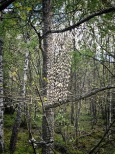Stephen McKenzies ”Friendly Fire” klär in två trädstammar i träplank. Andra installationer snarare intar träd, som Jenny Aschenbrenner och Alexander Moods ”Antropofil intervention” av typiska loppistavlor och texter som: ”Varför ska naturen förvägras kulturen?” Ana Svenhedens ”Dyss” består av tovad ull i bollar på tråd som placerats mellan två grenar ganska högt upp. Oerhört stiligt när man ser det mot björkstammarna bakom. Dyss betyder stänk på norska och precis så ser det ut, som mjuka stänk i lövverket. Annika Thörn Legzdins ”Not really here” består av tomma ramar placerade högt upp i en ek.