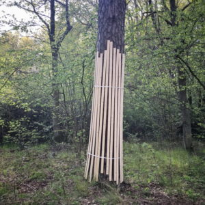 Frida Arvidsson har uppfört ”Arbor” i ena hörnet av ett öppet fält. En stor cirkel som markeras av smala höga pinnar som samlats in i närområdet. På långt håll ser det inbjudande ut, men pinnarna är placerade för tätt för att man ska kunna ta sig emellan. Cirkelns inre rum är bara tillgängligt för mindre djur.