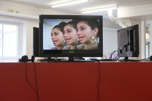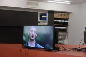 Till varje skärm finns ljudspår via hörlurar. Roxy Farhat och en annan kvinna i kostym berättar om Minimal Kompetens. En byrå som erbjuder kursen för att komma till rätta med patriarkatet, strukturen som legat i vägen för allt. Männen som genomgått utbildningen är nya befriande människor. Stilistiskt känns videon (ca 7 min) lika mycket som ett säljmaterial som upplysningskampanj. Tänk ändå om världen kunde bli en bättre plats bara av ett köp av rätt produkt.
