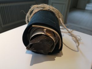 Spåren och avtrycken blir också med åren alltmer uttunnade. Hagbergs lösning på tecknets hopplösa otillräcklighet, detta att det på en gång visar för mycket och alldeles för lite, blev till slut förhöljandet av det gestaltade. Han började på 1980-talet alltmer att rulla ihop och med snören försluta sina pappersark och andra underlag – för övrigt ytterligare en hänvisning till den österländska bildtradition som var så viktig för både hans praktik och hans tänkande.