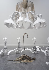 I stora salen hamnar vi sedan i döden. Där är ben uppradade över golvet, som efter en utgrävning. Ett slags fetischistiska rester sorterade efter kroppsdel istället för individ, i en massgrav av djur. Vid första anblicken vita och sterila, men vid närmare granskning ser jag kolavtryck av människohänder och symboler som kors och cirklar ritade på benresterna. Tillsammans med några skulpturer av gips, ben och hår blir det både sakralt och mystifierat.