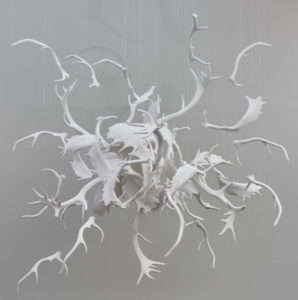 Trofé collection, den stora skulpturen med avgjutna horn som hänger i taket, erbjuder ett annat sätt att se på dessa traditionella troféer som pryder jaktstugor. Verket belyser dels det bisarra i en sådan praktik, men skapar också en annan närvaro i rummet. Kanske är hornen på väg upp från graven, till himmelen?