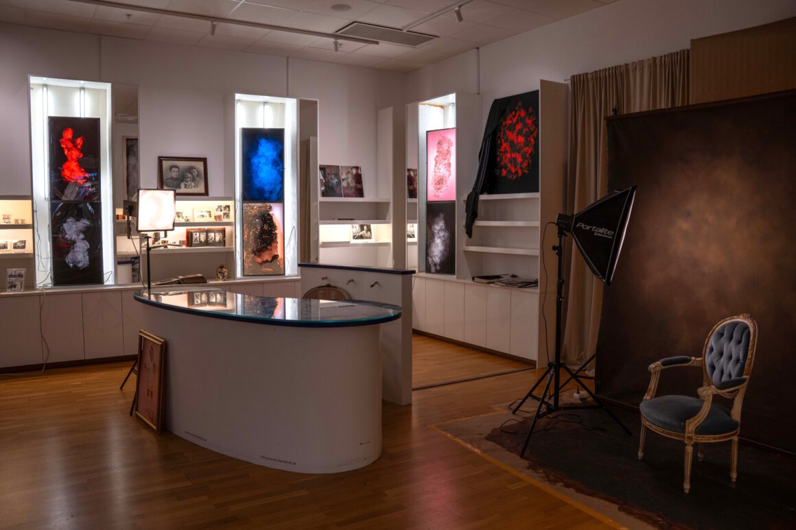 Den sociala aspekten är framträdande vid mitt besök i utställningen. Konstnären tar emot besökare bakom en disk. Det är flera som kommer med egna fotografier, och som också blir fotograferade i den uppsatta fotostudion. De samtal som når mina öron behandlar minnen och erinran av besök i fotobutiken. Jag förstår att det jag ser runt om mig är både en av konstnären genomförd iscensättning och en performativ aktivitet. Det pågår en insamling från människor som blivit förevigade någon gång för länge sedan som i skyltfönstret samlas till en växande kollektion gamla fotografier.
