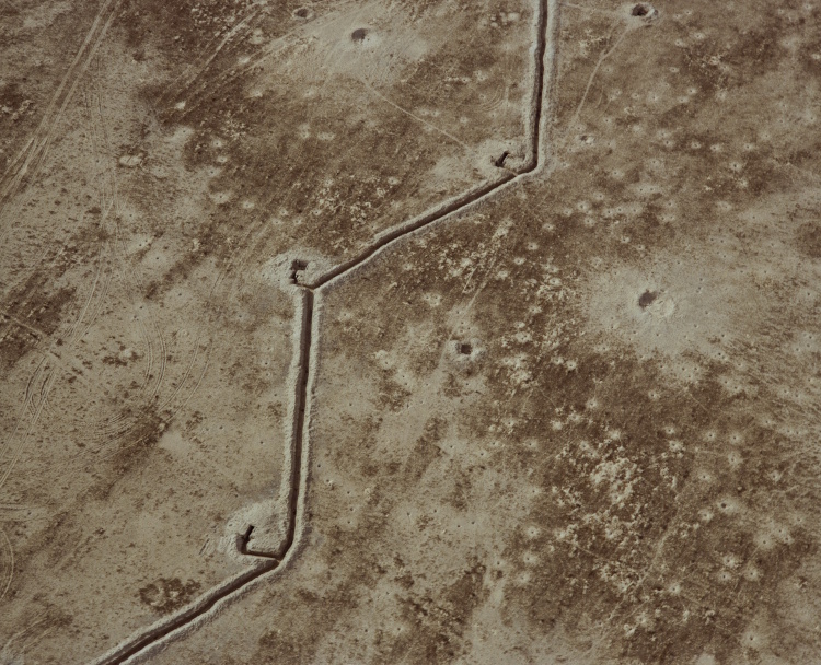 Ökenlandskapets jordfärger, enorma strukturer eller utsnitt av något mycket litet. Räfflor, sår i jorden. Som kartlinjer ritade direkt i sanden. Likheten med 60-talets jordkonst är påfallande.
