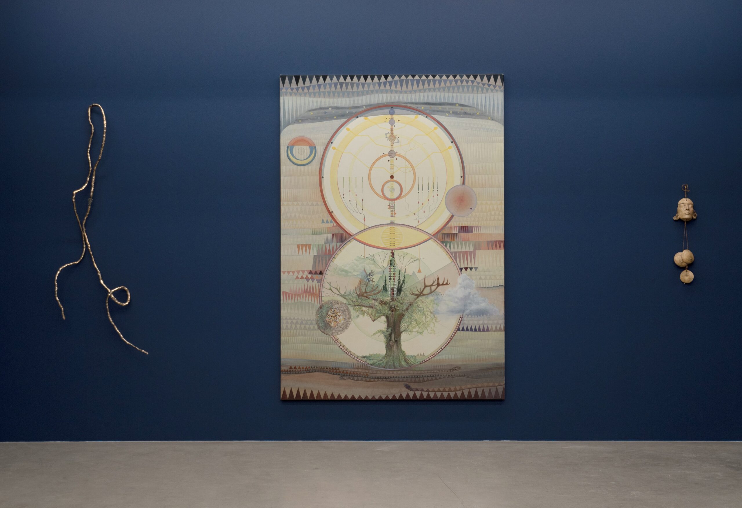 Charlotte Gyllenhammars upp-och-nedvända kvinnogestalt Night descend förankrar det första större utställningsrummet, som en fond mot vilken de övriga verken får förhålla sig. I spegling, i rakt motställd position, hänger Christine Ödlunds Världsträdet, nästan som en hemlig blinkning till ett av Gyllenhammars mest uppmärksammade verk, den upp och nedvända eken över Drottninggatan.