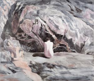 Människorna som befolkar bilderna är ofta nakna, utelämnade, eller sysselsatta med att klättra upp, bestiga och betvinga ett landskap som ju längre en betraktar det blir allt mer mystiskt och undanglidande.