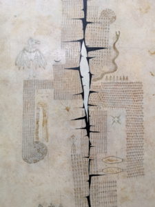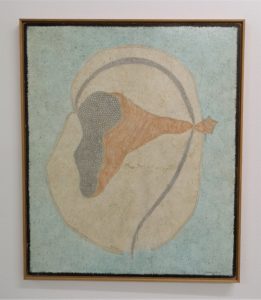 ”Till Oscar” står det också i en av målningarna på utställningen, och Reuterswärd har kallat henne för ”en spröd genomskinlig lyssnarinna med stora vetgiriga ögon”. Vad var det då som hon uppfattade och nedtecknade i sina målningar, där bilden ristades fram på ett så karaktäristiskt sätt? Ekström skrapade sig genom målningens tunna lager och fyllde sedan i ristningarna med ny färg. Resultatet gav bilden en matt glans, som från en värld under vatten. Eller genomlyst av en blek sol. Ytan på målningarna är sprucken och spröd, samtidigt som den tycks hårt pressad. Bildrummet skildrar en skiktad materia, där fossil av snäckor och växtdelar är förvandlade för evigt.