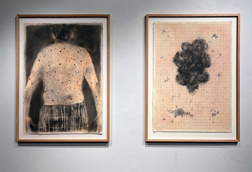 I det övre galleriet ställer Anna Persson ut teckningar och en film under utställningstiteln Sessions of Memories. Ett centralt verk är en teckning av en rygg full av leverfläckar. Mellan prickarna har linjer dragits som förvandlar hudpartiet till en karta över stjärnbilder. Ryggtavlan har blivit en natthimmel och huden, en del av universum. Ett tufsigt kortklippt nackhår och ett par rutiga pyjamasbyxor påminner om sårbar mänsklighet men strecken som dragits mellan prickarna gör människan helt enorm. Det är en himla fin bild av konsten, som metafor för skapandet och som uppmaning till betraktaren att se mönster.